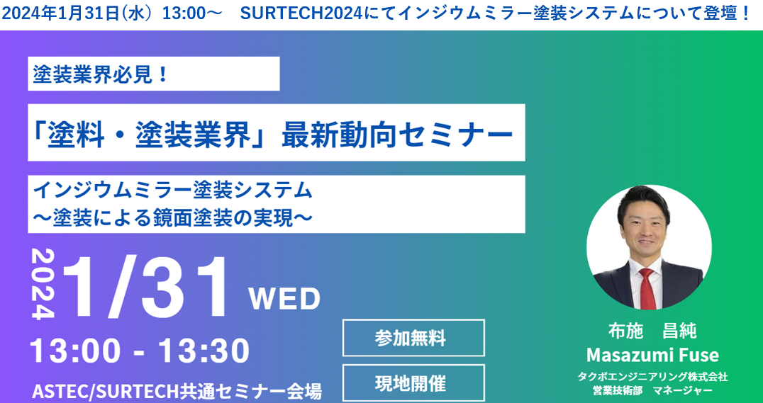 大家好!1月31日,日本東京的BIGSITE會場上,SURTECH表面技術(shù)要素展會如期舉行,吸引了來場人數(shù)達12605人。在這次展會中,一場備受矚目的宣講會——【涂料?涂裝業(yè)界最新動向宣講會】更是成為焦點。