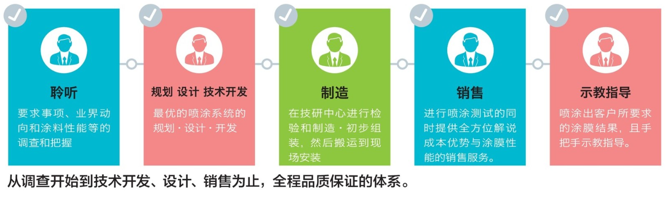 作為涂裝解決方案提供商,我們以解決客戶的要求、難題為出發(fā)點(diǎn),從確認(rèn)生產(chǎn)環(huán)境開(kāi)始直至完成設(shè)計(jì)構(gòu)想。試噴涂、制造、搬入安裝、然后進(jìn)行噴涂生產(chǎn)。提供開(kāi)發(fā)、制造、銷售等一條龍服務(wù)。